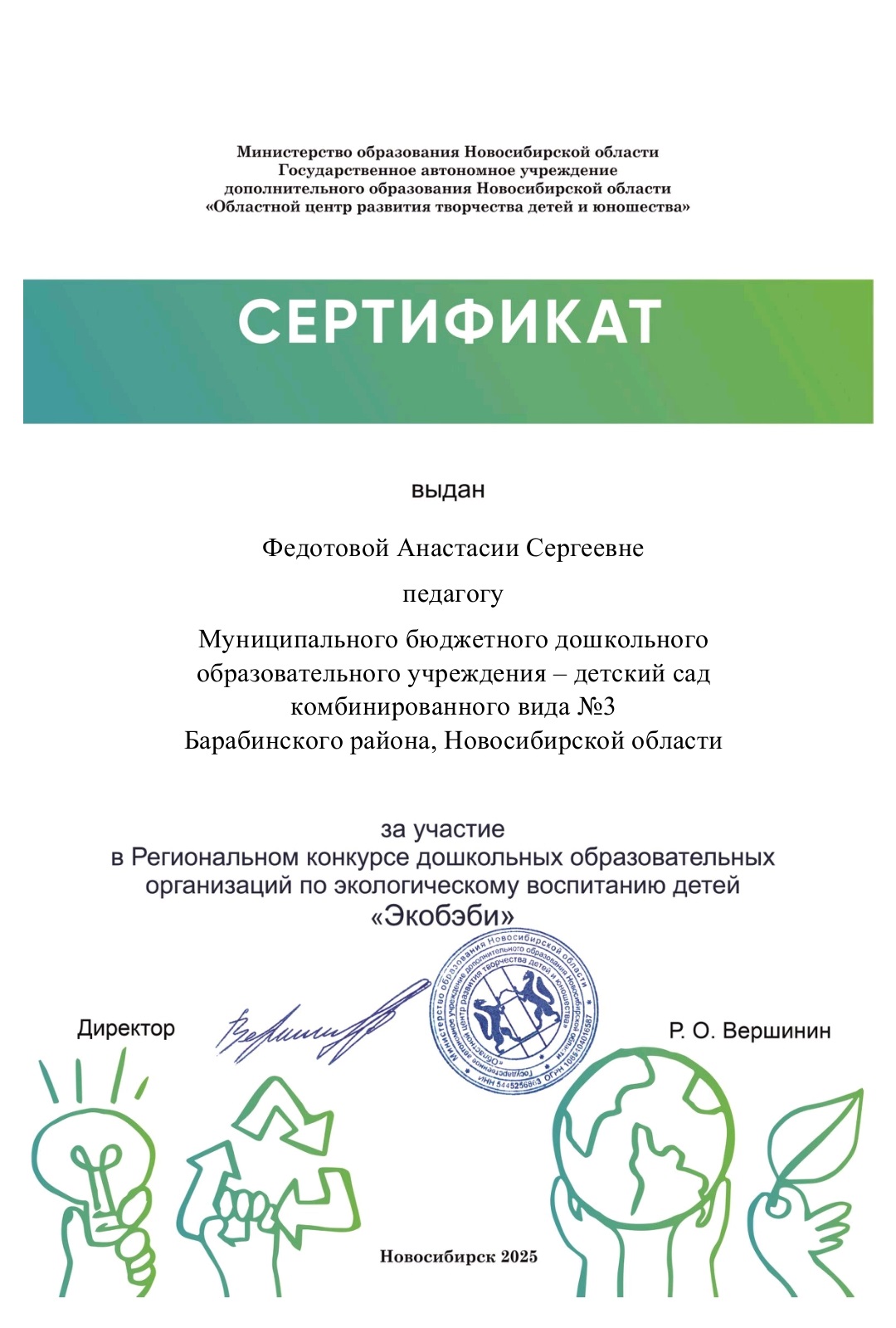 Региональный конкурс дошкольных образовательных организаций по экологическому воспитанию детей "Экобэби-2025". Сертификат участника
