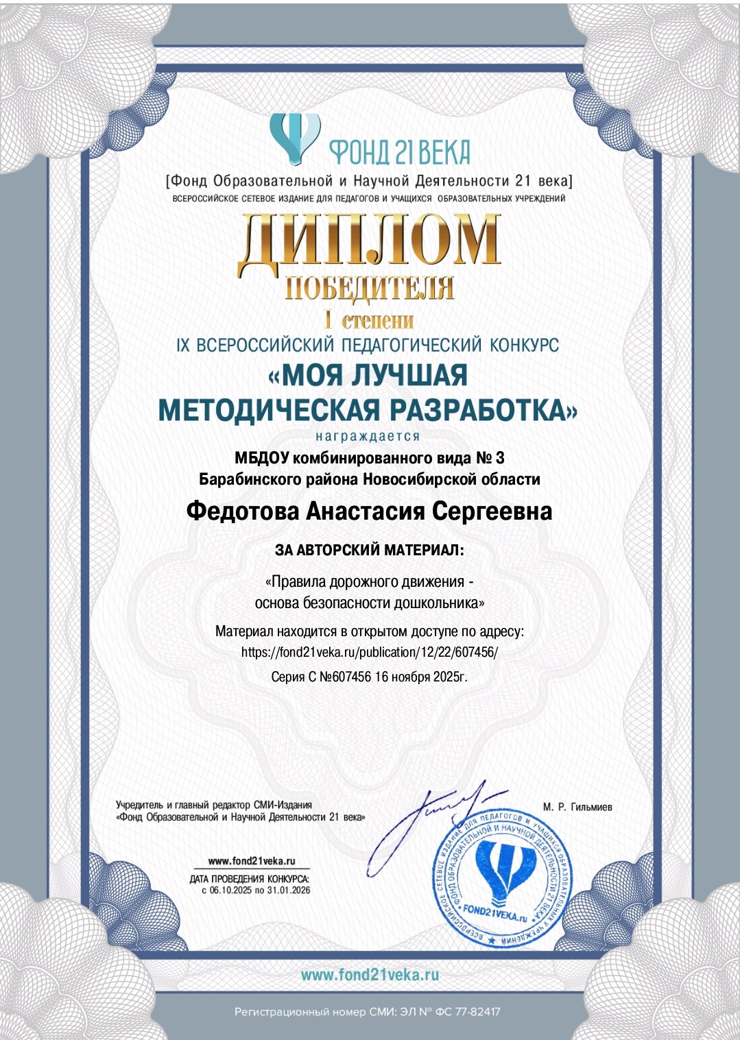 Всероссийский педагогический конкурс "ФОНД 21 века". Номинация "Нравственно-патриотическое воспитание детей младшего дошкольного возраста посредством игр ТРИЗ" Диплом 1 степени